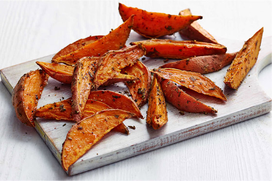 من السهل استبدال البطاطا بالبطاطا الحلوة التي تُحتسب ضمن الحصص الخمس اليومية من الفاكهة والخضراوات. من السهل خبز هذه البطاطا الحلوة المقلية وإكليل الجبل لتناولها كوجبة خفيفة على الأريكة أو في ليلة مشاهدة الأفلام.