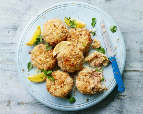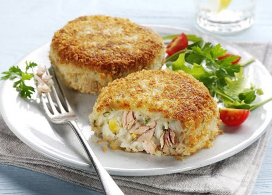 3. باستخدام ملعقة قياس (بمقدار 1/4 كوب)، شكلوا خليط التونة إلى كرات ثم اضغطوا عليها قليلاً لتصبح فطائر مسطحة. إذا كنتم تفضلون، يمكنكم أيضاً استخدام يديكم لتشكيل الكرات.