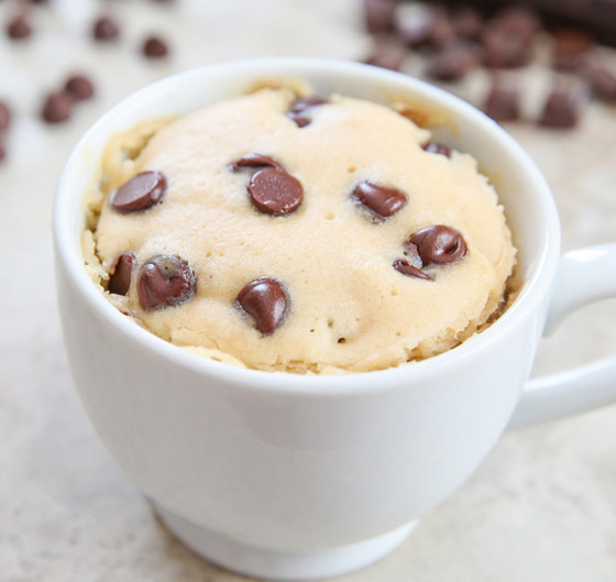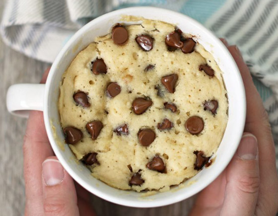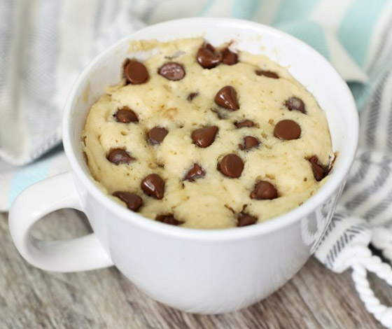 5. بعد أن يبرد الكوب، هو يطلى بزبدة الفستق، فتوزّع رقائق الشوكولاتة عليه، ويدخل مجدّدًا إلى الـ"ميكرويف"، على الحراة الأدنى، وذلك لثلاثين ثانية.