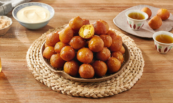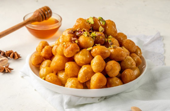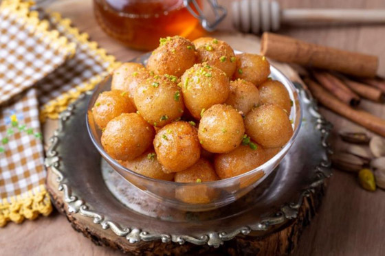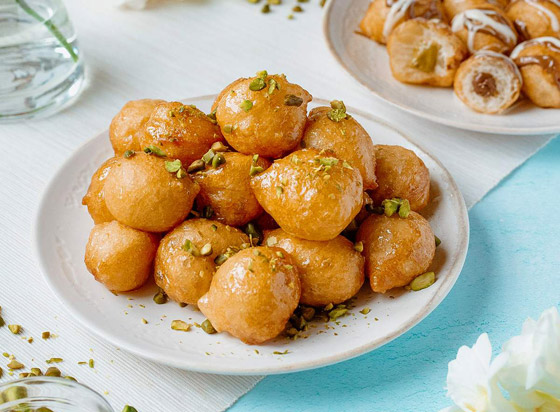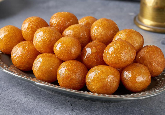 6. صفّوا كرات اللقيمات من الزيت وضعوها في القطر مباشرة، ثم ارفعوها وضعوها في طبق التقديم، وقدموها.