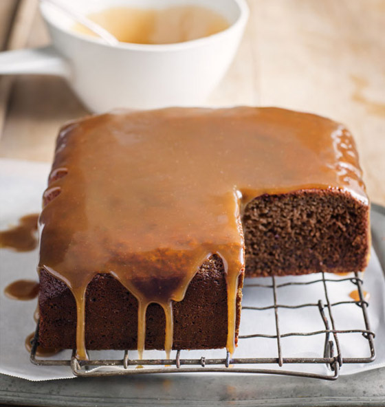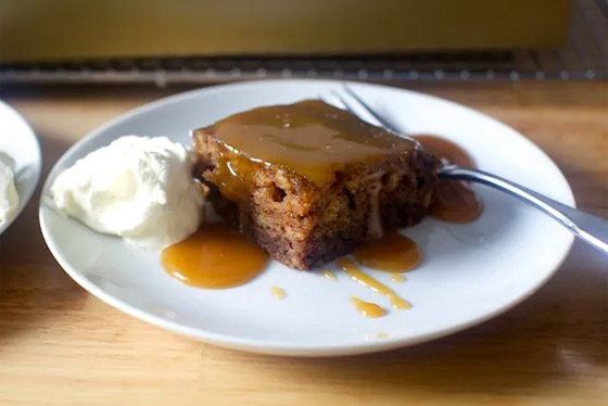 12. صبوا صوص التوفي الدافئ فوق كيكة التمر الساخنة وقدموها مباشرة.