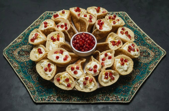 4. وزعوا الرمان على القطايف وضعوها في طبق التقديم وعند التقديم وزعوا الشيرة عليها حسب الرغبة.