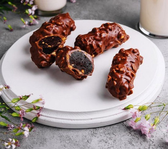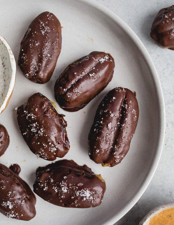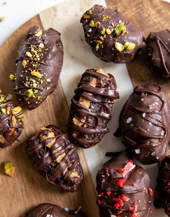 5. ضعوا حبات التمر المغطاة بالشوكولاتة في طبق التقديم، وقدموها.