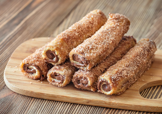 1. تخلصوا من أطراف التوست، وافردوه، ثم ادهنوها بالشوكولاتة السائحة، ثم لفوها على شكل رولات.