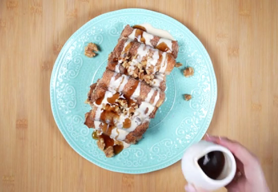 3. نخرجها من الفرن بعد أن تتحمر، ونغمسها بالصوص المحضر من الجبنة الكريمية، وكريم شانتيه، بعد خفقه في الخلاط، أو نقدم إلى جانبها صوص الكراميل، وجوز البقان.