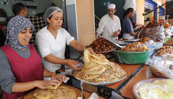 بائعات يعرضن أنواع الخبز المغربي الشهير في العاصمة المغربية الرباط. ويظهر خبز البطبوط الشهير محلياً.