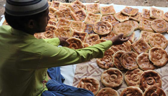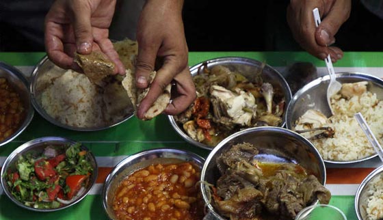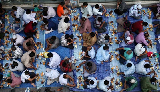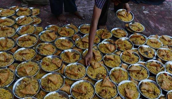 تجهيز وجبات الإفطار للمتعبدين في جامع في مدينة لاهور الباكستانية. الأرز والدجاج من أشهر الأصناف التي تعطي الشعور بالشبع وتمد الجسم بالطاقة. ويزين الأطباق صنف السمبوسة المقلية المشهور في شبه الجزيرة الهندية.