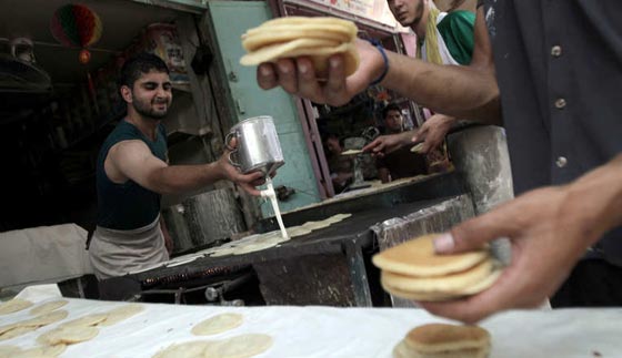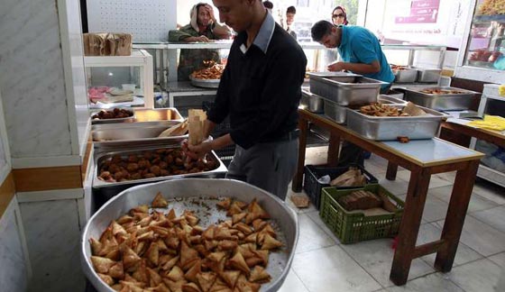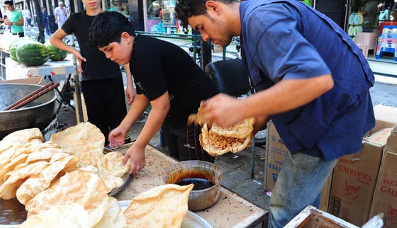 مجموعة من الشبان يحضرون حلوى الناعم في سوق في قلب مدينة دمشق. ويعتبر الناعم، المكون من خبز مقرمش محلّى ودبس العنب أو التمر، من أشهر الحلويات الرمضانية في دمشق، والتي تعود إلى العصر الأموي.