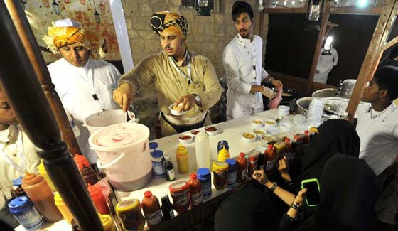 نساء تجمعن أمام كشك لبيع البليلة، أو الحمص المسلوق المنكه بالتوابل، في إحدى ليالي رمضان في مدينة جدة الساحلية. ويظهر البائعون وهم يرتدون عمامات تميز سكان منطقة الحجاز.