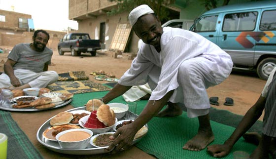 رجل يضع طبق طعام استعداداً لوقت المغرب في جارف الغربية، الواقعة شرق العاصمة السودانية الخرطوم. ونرى أصناف الطعام المشهورة محلياً، مثل شوربة النعيمية السودانية.