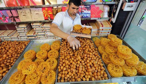 بائع حلوى إيراني يرتب الزلابية (المشبك) والبامية (بلح الشام) في أطباق لبيعها. ويرتبط هذين الصنفين من الحلويات بشهر رمضان في إيران.