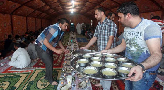 إعداد مائدة الإفطار في أحد الخيم الرمضانية المخصصة للفقراء في العاصمة العراقية بغداد. ونشاهد شوربة العدس التي تعتبر من أهم المقبلات على مائدة الإفطار في العراق وغيرها من الدول العربية.