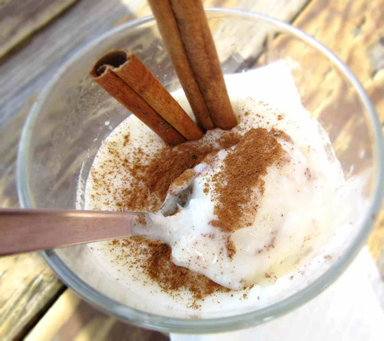 1. في قدر على حرارة متوسطة، ضعي نصف كوب من الحليب مع عود القرفة.