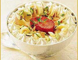 اغلي الحليب حتى يسخن ثم ضعي السميد وحركيه حتى يجمد قليلا ثم اخفيقي البيضات مع ملعقة كبيرة بيكنج بودر وملعقة فانيلا ثم نضعهم الى الحليب والسميد واتركيه حتى يسمك ثم ضعي ماء الزهر ومن ثم اسكبيه في صحون التقديم مع القطر و تستطيعين تزينها بالفستق و التوت حسب الرغبه.