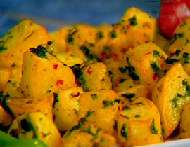 4. ابعدي البطاطس عن النار وأضيفي إليها الكزبرة ثم ضعيها في صحن التقديم .