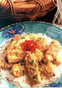 9- يقدم السمك مع الأرز ويزين بما تبقى من الكزبرة .