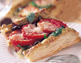 يحمى الفرن لغاية 375 درجة وتخبز فيه الصينية حتى تنتفخ العجينة وتنضج، ثم تقطع الفطيرة الى شرائح وتقدم بمثابة نوع لذيذ من المقبلات أو كوجبة للغداء أو في الحفلات