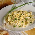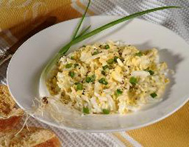 نقشر البيض، ونضعه في وعاء عميق، ونقطع البصل الأخضر إلى قطع رفيعة، الجزء الأبيض والأخضر. ونضيف بقية المواد ونخلطها مع بعضها البعض بلطف.