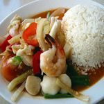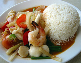 3.في الوقت نفسه يسخن باقي الزيت في طاسة. يضاف الجمبري والكالاماري و السمك و و يقلب لمدة 5-7 دقائق. تضاف المأكولات البحرية الى الارز وتقلب جيدا. تغطى وتترك لمدة 7-10 دقائق. يرفع عن النار و تضاف الكريمة اللباني والجبن. تقلب جميع المكونات حتى يذوب الجبن داخل الارز. يقدم فورا.