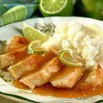 2 - في وعاء التقديم.. نضع صدور الدجاج وتقطع كما هو موضح بالصورة وتسكب عليها الصلصة وتقدّم مع بطاطس مهروسة.