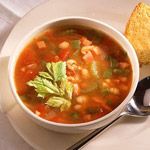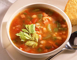 سخني الزيت في مقلاة كبيرة على درجة حرارة أعلى من المتوسطة، ثم أضيفي البصل وعندما يصير طريا أضيفي الثوم وقلبي لدقيقة تقريبا. أضيفي المرق والطماطم وصلصة الطماطم، وعندما يغلي المزيج، اخفضي درجة الحرارة واتركي المزيج مغطى على النار لمدة 10 دقائق. أضيفي الفاصوليا والفلفل والتوابل، واتركي المزيج على النار لمدة 5 دقائق إضافية. تبلي الحساء بالملح والفلفل، ثم ضعيه في أطباق، وقدميه مزينا بأوراق الريحان المنعشة.