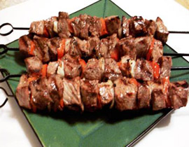 انقعي الأسياخ الخشبية في المياه إلى أن تصبح لينة. افرمي البصل ناعماً واخلطيه مع الكاتشب وصلصة الباربكيو والملح والفلفل والبهار وجوزة الطيب والزيت. اخلطي التتبيلة جيداً واسكبيها فوق اللحم، ثم غطيه واتركيه داخل الثلاجة مدة خمس ساعات. اشبكي اللحم بالأسياخ واشويه على وهج الفحم أو في الفرن.