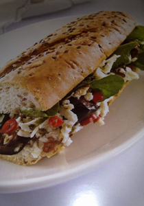 يخلط الباذنجان مع ملعقة زيت زيتون ونص ملعقة الاوريغانو، والملح والفلفل الاسود ثم يشوى على الشوايه، تضاف الجبنه الى الباذنجان والجرجير والفلفل الاحمر مع بقية زيت الزيتون والاوريغانو تقطع الباجيت في الوسط وتحشى بالخلطه ثم تقدم.