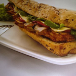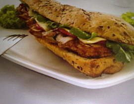 تحمر شريحة دجاج فيليه بالبقسماط بالزيت وتصفى، يقشر الفلفل البارد ثم يقطع مع البصل مكعبات، يدهن الباجيت من الداخل بالمايونيز ثم يحشى بشرائح ا لدجاج الفلفل البارد ثم الجبن ثم تشوى بالفرن حتى تسيح الجبنه تحشى بالجرجيروتقدم.