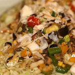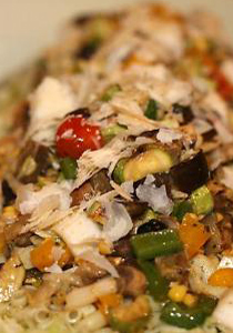 امسحي الخضروات بزيت الزيتون. اشويها على الشواية من الجهتين. فرشي الخس في طبق التقديم. الخطي الباستا مع الخضروات المشوية والزيتون والذرة. ضعيها على الباستا. رشي عليها جبن البارميزان. اسكبي عليها الصلصة، التي تخلط مقاديرها في الخلاط الكهربائي حتي يتغير لونها، وقدميها.