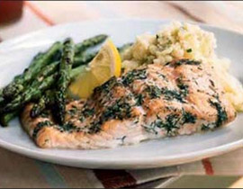 3 ـ ضعيها فوق السالمون بعد رشها بزيت الزيتون، ثم رشي المقادير بالملح والفلفل الأسود والبارمازان