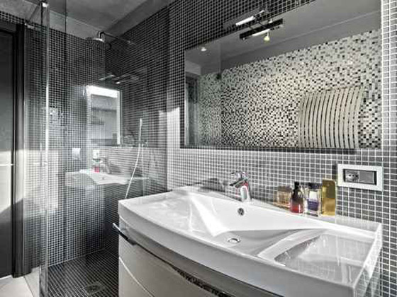 السيراميك باللون البيج الفاتح، حيث تتميز قطع السيراميك بأنها متوسطة الحجم وسادة بدون أي نقوش وتتوسط الحائط والبانيو قطع من نفس النوع بألوان مختلفة من درجات البني، كما تتميز الأرضية باللون البني بمربعات أكبر حجمًا.