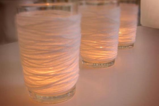 استخدمي الفرشاة لترسمي بالغراء خطًا متوسط العرض في وسط الكوبضعي خيط الصوف فوق الغراء وابدئي بلفه حول الكوب من الوسط وصولاً إلى أطرافه. ضعي خيط الصوف فوق الغراء وابدئي بلفه حول الكوب من الوسط وصولاً إلى أطرافه. أكملي لف الخيط حتى تصلي إلى سماكة تشبه الكوب في الصورة (احذري التقليل إذ يفقره والإكثار إذ يمنع ضوء الشمعة من الظهور). عند انتهائك من لف الخيط، اقطعي طرفه بالمقص. استعملي الفرشاة لتضعي القليل من الغراء (تجنبي اكثاره حتى لا يظهر) وألصقي طرف الخيط بتأن. ضعي الكوب لمدة لا تتعدى الثلاث دقائق حتى يجف الغراء. بعد أن تتأكدي من جفاف الخيط، ضعي الشمعة داخل الكوب وأشعليها.أعيدي الخطوات نفسها حتى تحصلي على الكمية التي تلزم مائدتك، وضعيها بالشكل الذي يحلو لك!
