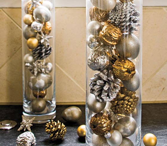 املئي الاواني الكريستالية باكسسوار الاعياد كالكرات الملونة ووحدات الصنوبر الجافة بعد رشها بطلاء ذهبي وفضي.. استخدمي مخيلتك واشركي اطفالك في التجهيزات الممتعة.