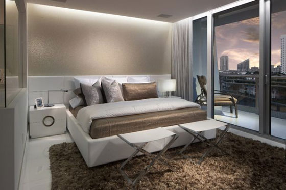 في الصورة العلوية: نمط الاضاءة المختبئة الناعمة، حيث تختبى الاضاءة وراء فواصل في الحوائط تم تصميمها فنياً بذكاء للحصول على توزيع ناعم للاضاءة، فيبدو السرير مضاءاً كما لو انه يشع بالاشراق والسعادة في منظر يبعث على الاسترخاء.