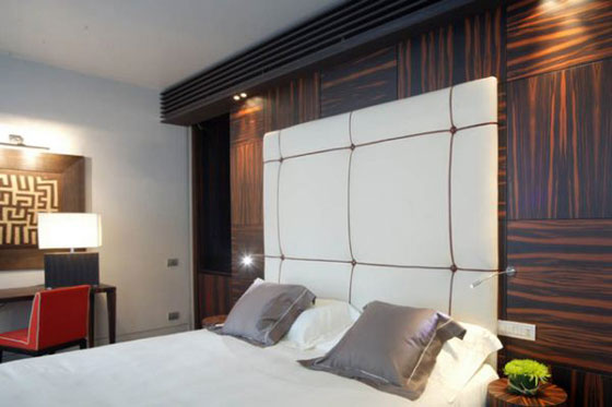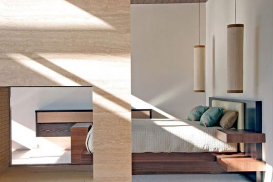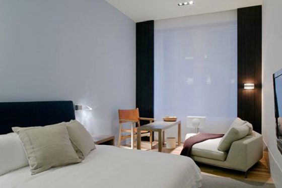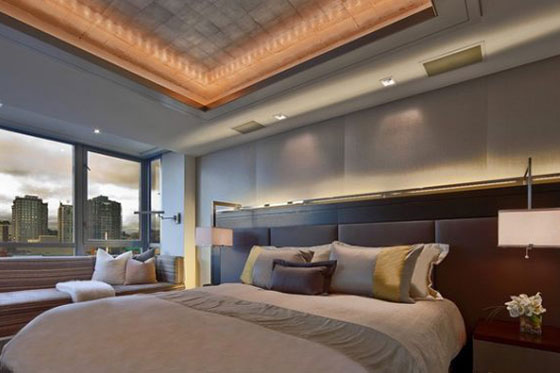 لا يمكن الحصول على بؤرة محددة للاضاءة في هذه الغرفة، فالاضاءة الناعمة تختبئ خلف الحوائط وعند خلفية السرير وفي السقف، فتنتشر لتمنح الغرفة الهدوء الناعم الفندقي.