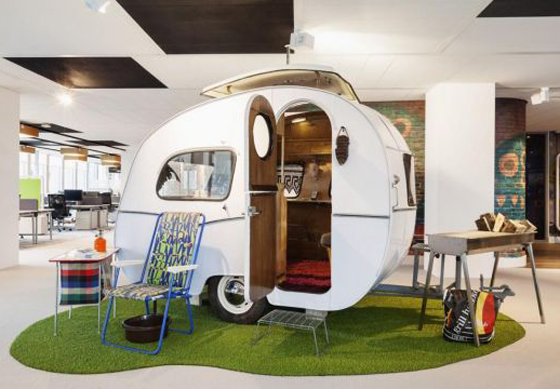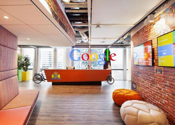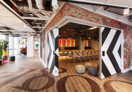يُلاحظ وجود عناصر غريبة ومثيرة للدهشة في هذا المكان، الذي كان مجرد مرآب، حيث بدأ مؤسسا "جوجل" لاري بايدج" وسيرغي برين عملهما، وسرعان ما أمسى مساحة مريحة وملائمة للإبداع! وقد صمّمت جدرانه من الطوب، وطغت الألوان الفرحة والمفروشات المريحة عليه.