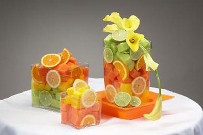 باقة ورد بألوان الربيع والاناء يمتلئ بالفواكه والحمضيات