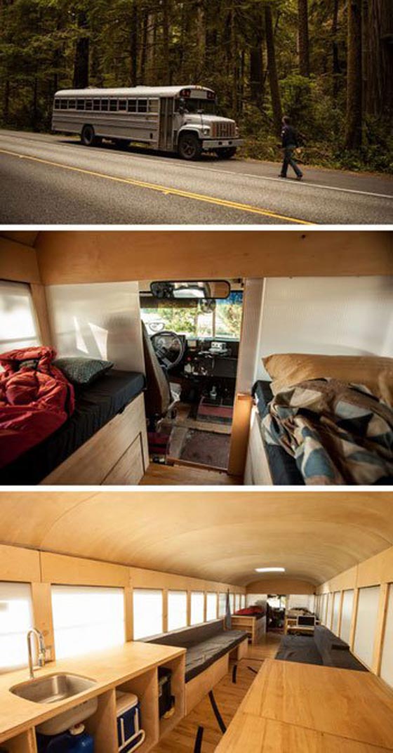 اتوبيس من الخارج ومن الداخل منزل متكامل من غرفة نوم وغرفة معيشة ومطبخ