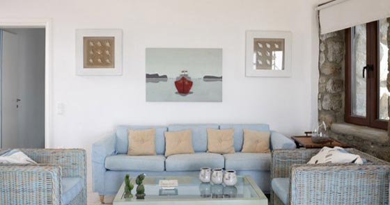 تعتمد الألوان في الفيلا على ألوان الطبيعة المحيطة من سماء ومياه وارض وجزر