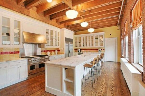 في المطبخ الفسيح، تستمتع المالكة بتحضير الكعك المحلّى المفضل لديها على "الجزيرة" التي ترفع سطحاً رخامياً يتمظهر منسجماً مع خزائن الخشب البيضاء التي تغطي الجدران المطلية باللون الأصفر "الباستيل".