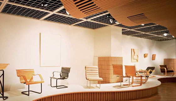 استخدم هذا التصميم في معرض نيويورك للفن الحديث لعرض قطع من الأثاث والأعمال الزجاجية بيد آلفار آلتو، لكن المشكلة حينها تمثلت بأن لا يكون الخشب الموجود بالقطع المعروض جزءاً من مساحة العرض الثانوية، لذا قرر المصممون هنا توفير الموارد والحد من إضاعتها، واستعاضوا عن الخشب بالأنابيب المكونة من الورق المقوى.