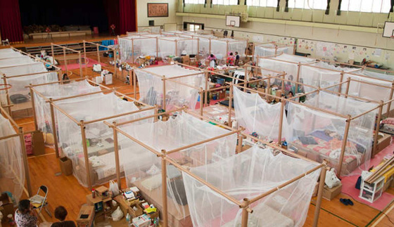 بعد الهزة الأرضية التي شهدتها منطقة كوبي اليابانية، قام بان بتطوير نظام ورقي يسمح بسرعة تثبيت أسرة مخصصة للناجين من الكوارث، وتخصيص مساحة شخصية للحفاظ على خصوصية كل شخص، ويظهر بالصورة أعلاه المشروع الذي أنشأه لإيواء الناجين من التسونامي الذي ضرب اليابان عام 2011 والأضرار التي وقعت بمفاعل فوكوشيما النووي بالعام ذاته.