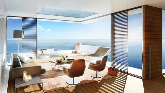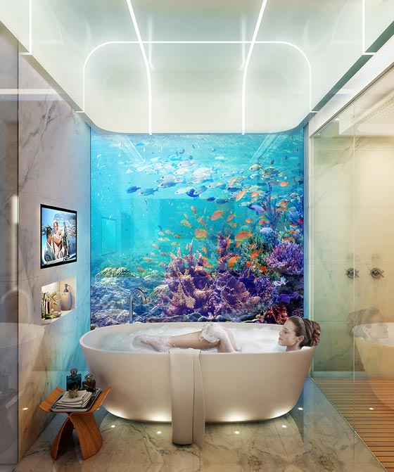 ستكون غرفة النوم الرئيسة والحمام مغمورين كلياً تحت الماء، وستشرفان على مناظر خلابة من الشعاب المرجانية والحياة البحرية، والطابق على مستوى البحر مزود بنوافذ من الأرضية وحتى السقف.