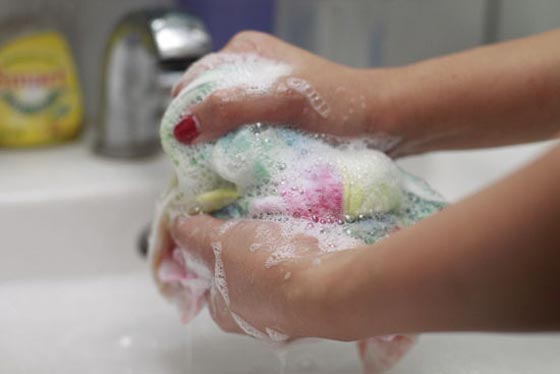 حك البقع بطريقة عنيفة يدمر الأقمشة، خاصة الهشة منها ولكن عليك بدلا من ذلك وضع المسحوق أو المنظف على البقعة وفركها بالأصابع وإعادة شطفها وغسيلها عدة مرات، وتستغرق البقعة عادة 15 دقيقة في الإزالة إن لم تكن شديدة الاتساخ.
