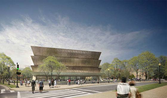 المتحف الوطني لتاريخ وثقافة الأميركيون الأفريقيون، واشنطن العاصمة: سيفتتح العام المقبل التنزاني ديفيد أدجاي المتحف الوطني الجديد للتاريخ وثقافة الأمريكيين من أصول أفريقية في واشنطن العاصمة. سطح المبنى الخارجي مغطى بشبكة معقدة من البرونز، كذكرى لعمل الحديد الذي قام به العبيد في الجنوب بعد التحرير.