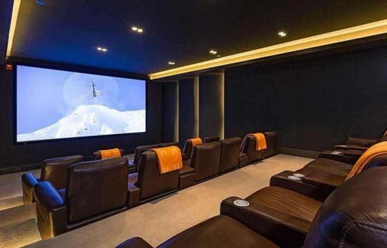 - في منزل الثنائي الواقع في "كيلوا" بــ"هاواي"، خصّص الثنائي غرفة في الطبقة الأرضية لتستضيف صالة السينما. تتصدّر الأخيرة شاشة عملاقة، كما تضمّ عدداً من المقاعد المريحة المغطّاة بالجلد البنيّ، والموزّعة على صفّين. إشارة إلى أن المقاعد في كلّ صفّ تلائم حركة الجسم، وتؤمّن الراحة المطلوبة لشاغلها، فيما تكتسي الأرضيّة بــ"الموكيت" البيج العازل للصوت.