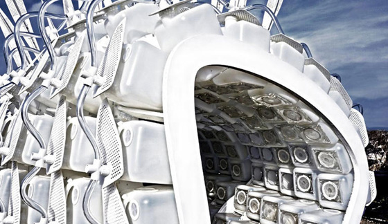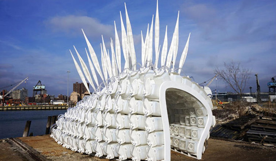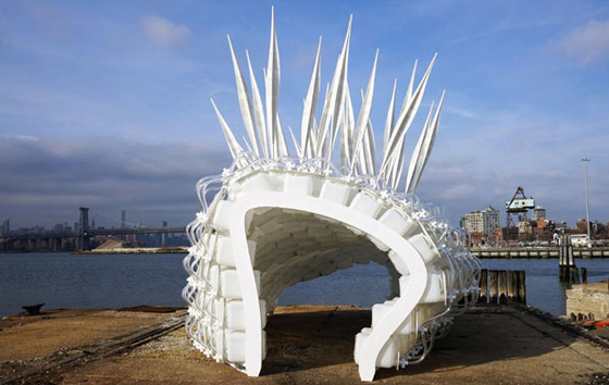 ويتكون المبنى الواقع في بروكلين نافي يارد في مدينة نيويورك الأمريكية، من وحدات مفصلة من إطارات رقائق الخشب، و264 حجرة بلاستيكية، أو ما يسمى بمنازل الحشرات، موضوعة داخل الإطار ومكدسة فوق بعضها. وفي حال وقوع كارثة طبيعية ما، يستطيع المأوى بتصميمه الجاهز أن يُنقل إلى أي مكان. كما صمم غلافه الخارجي ليوفر حماية من عناصر الطبيعة، فضلاً عن تميزه بنظام للزراعة المستدامة، لإنتاج أطعمة بنسبة مرتفعة من البروتين في المناطق المنكوبة.