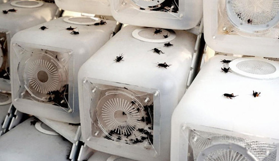 العناصر الخارجية لمزرعة الحشرات تسمح بتدوير الهواء وتنقل الصراصير بين الحجرات.