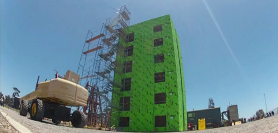 ننشر فيما يلي لقطات تصور لقطات اكبر اختبار من نوعه على مبان مقاومة للزلازل ولا تتهدم. وقد راقبت عشرات الكاميرات المبنى المكون من ستة طوابق، والذي عرضه المهندسون لزلزال مصطنع تبلغ قوته ستة فاصل سبعة درجات على مقياس ريختر، وهي ذات قوة الزلزال الذي ضرب منطقة نورث ريدج في عام 1994.