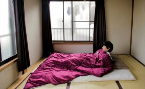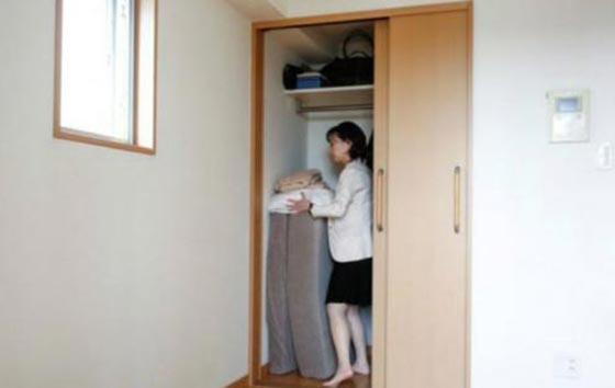 سايكو كوشبيكي تخزن متعلقاتها وفراش النوم الفوتون في ركن بشقتها في فوجي ساوا.